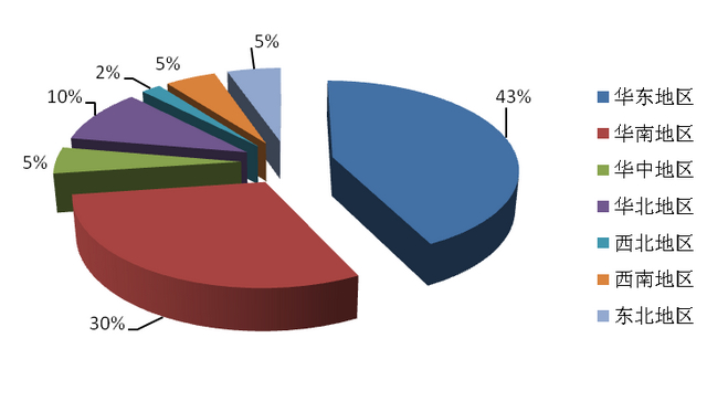 華東地區43% 華南地區30% 華北地區10% 華中地區 5%
