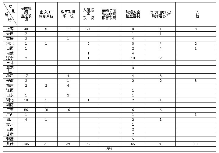 一、個(gè)省、自治區、直轄市獲得生產(chǎn)登記批準書(shū)的安防產(chǎn)品生產(chǎn)企業(yè)數量(354共家):