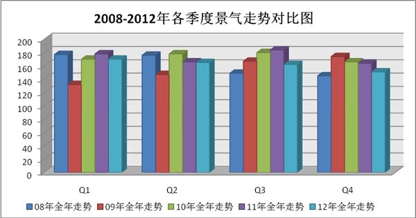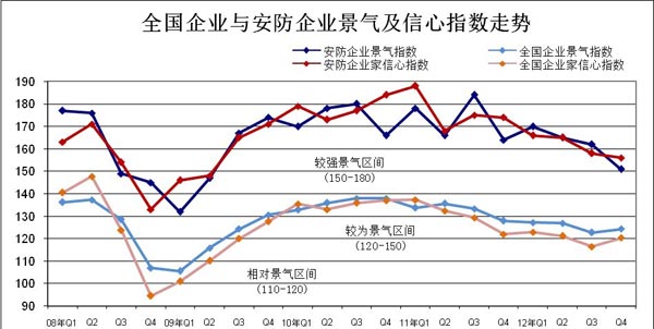 安防由于歷史較短,規模較小,在國民經(jīng)濟核算中還沒(méi)有作為一個(gè)獨立行業(yè),因此相應的行業(yè)統計調查制度和調查體系都沒(méi)有建立起來(lái),對行業(yè)發(fā)展規模、速度、結構、布局、市場(chǎng)、趨勢,以及企業(yè)投入、效益等等情況都無(wú)法進(jìn)行科學(xué)的衡量,對存在的問(wèn)題無(wú)法及時(shí)反映。自2008年起,《中國安防》雜志編輯部開(kāi)始按季度進(jìn)行安防行業(yè)景氣調查并發(fā)布相關(guān)信息,現將2012年全年情況分析如下。
