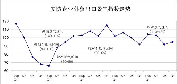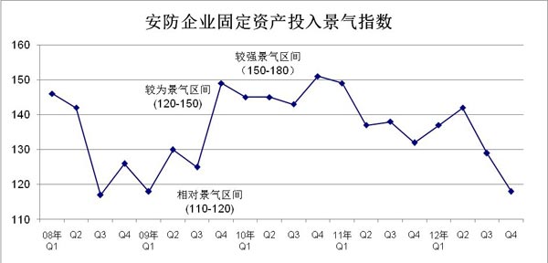 受各方面因素影響,2012年前三季度安防外貿出口景氣度也出現三連陰,一度從微弱景氣區間跌落到微弱不景氣區間,到四季度才稍有回暖。(見(jiàn)圖4)圖4安防企業(yè)固定資產(chǎn)投入景氣指數同樣走出一揚三挫的局面,僅在第一季度出現環(huán)比上漲,此后連續三個(gè)季度都出現下行,而且在第四季度從“較為景氣區間”跌至“相對景氣區間”,該季度也同比成為自金融危機時(shí)期以來(lái)的歷史最低水平。(見(jiàn)圖5)。