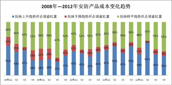 從2012年安防產(chǎn)品的成本變化來(lái)看,第一、三、四季度,安防產(chǎn)品的成本變化趨于穩定,反映成本上升的比重基本維持在39%和36%。只有第二季度出現大幅度波動(dòng),其中,反映成本上升的比重達到61%,達到了調查歷史以來(lái)最高水平。(見(jiàn)圖7)