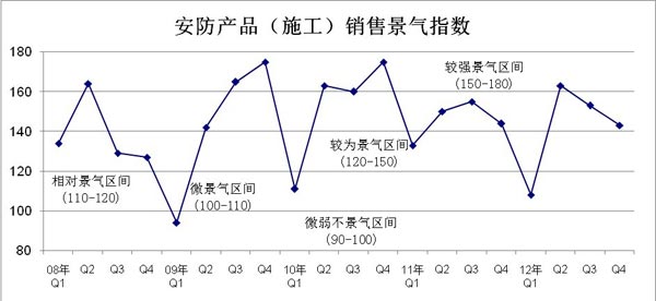 通觀(guān)五年來(lái)的調查數據,安防產(chǎn)品(工程)銷(xiāo)售景氣指數在一季度都會(huì )出現規律性上揚,即使在宏觀(guān)經(jīng)濟增速略有下滑的2011年,該年一季度數據仍然出現小幅上行。這個(gè)規律在2012年同樣得到了驗證。然而在出現大幅上行之后,從去年二季度開(kāi)始景氣指數也出現了連續三個(gè)季度的下滑,到第四季,景氣也由“較強景氣區間”跌至“較為景氣區間”。(見(jiàn)圖6)