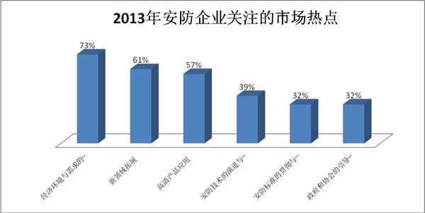 2012年,安防行業(yè)遭遇歷史性下滑,全年四季度連續出現下行態(tài)勢。這讓我們對明年的市場(chǎng)發(fā)展和走向有了更多的期待。從調查情況來(lái)看,2013年安防企業(yè)關(guān)注的重點(diǎn)集中在外部環(huán)境、新領(lǐng)域和高新應用等幾方面。其中,安防企業(yè)對外部經(jīng)濟環(huán)境和市場(chǎng)需求的變化關(guān)注程度最高,占調查比例的73%;其次對新領(lǐng)域的拓展和高清產(chǎn)品的應用也保持了濃厚的興趣,占調查比例的61%和57%。(見(jiàn)圖8)