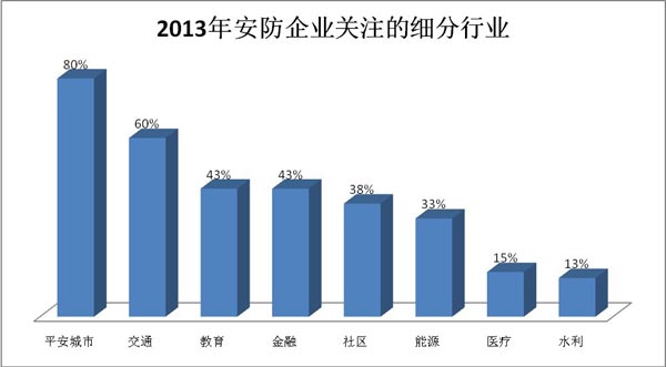 而從關(guān)注的行業(yè)來(lái)看,平安城市仍然是明年安防企業(yè)關(guān)注的最大焦點(diǎn),有80%的企業(yè)對該領(lǐng)域給予關(guān)注;而有60%和43%的企業(yè)對交通、教育和金融有很高期待;此外,社區和能源領(lǐng)域也保持了相對高的關(guān)注度,而前幾年較為熱門(mén)的醫療和水利領(lǐng)域,關(guān)注程度略有減少。(見(jiàn)圖9)